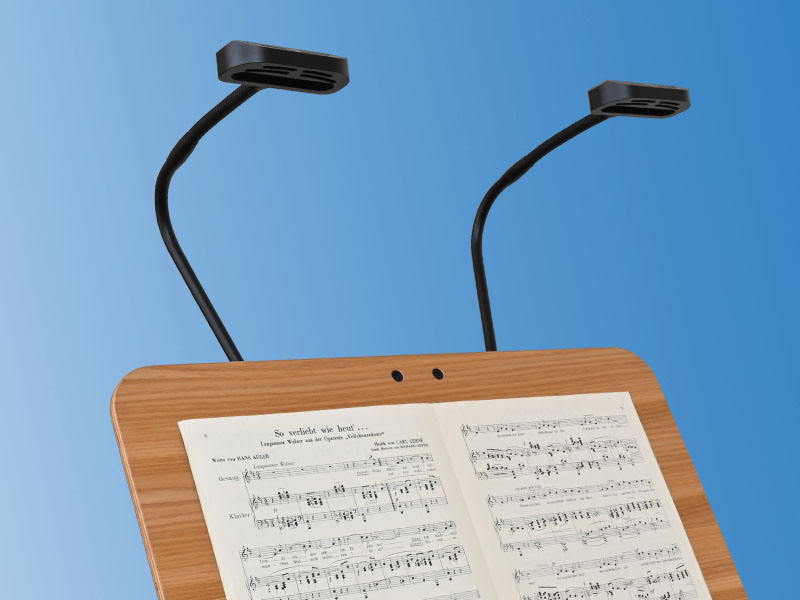 The 1602 series music stand lights have two adjustable lamp heads, which are equipped with 3000 K warm white and 5600 K cool white light colors and allow an unobstructed view of the conductor.